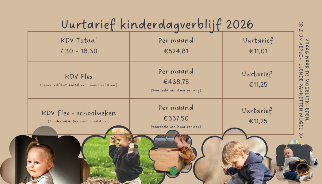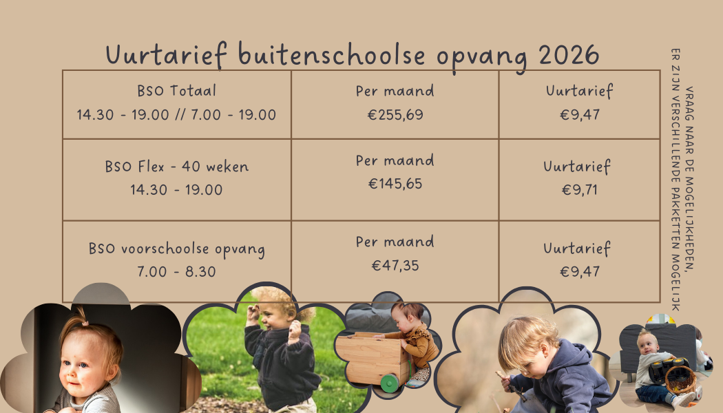 Voor een duidelijk overzicht, is het altijd mogelijk om een offerte bij ons aan te vragen zodat jullie precies weten wat de opvang kost. De Belastingdienst geeft in de meeste gevallen een tegemoetkoming in de kinderopvangkosten, de kinderopvangtoeslag. Jullie kunnen dit bekijken op